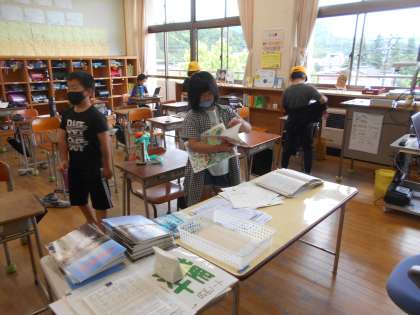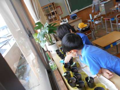 宿題を提出した後、学級の生き物(動物や植物)の世話をしていました。ヘチマも予想以上に発芽率が高く、ほとんどの種から芽が出てきました。