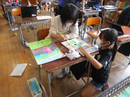 図画工作科で進めている「まぼろしの花」が完成に近づいてきました。早く終わった子供の中には、パソコンを使って作品の詳しい解説をつくっている子供もいます。全員の完成が待ち遠しいです。