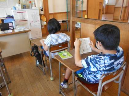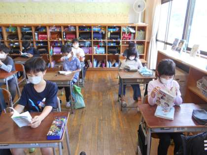 月曜日は読書の日です。家から持ってきた本、図書室で借りた本等、自分が読みたい本の世界に入っていました。ドラえもんのまんがを読んでいるように見える子供もいますが・・・これは、図書室でかりた「〇〇の世界」シリーズです。