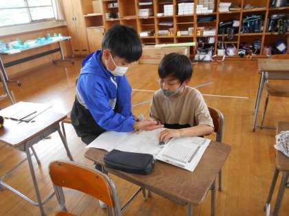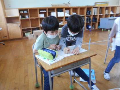 算数の様子です。一通りの筆算を終え、いろいろなタイプの筆算練習に取り組みました。「やり方が混乱する〜」と友達と話しながらも、教え合っていました。