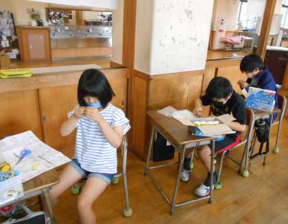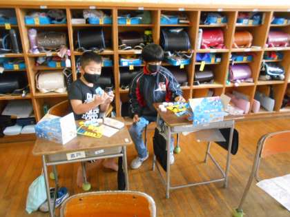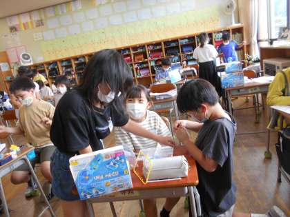 今日の理科は、3年生で学習した「電気のはたらき」を思い出した後、これから使う実験装置を組み立てました。男子はこの手の工作が得意なようで、まわりの友達に組み立て方を教えていました。