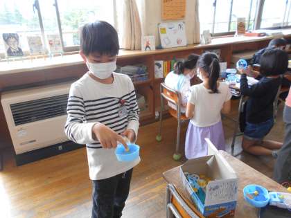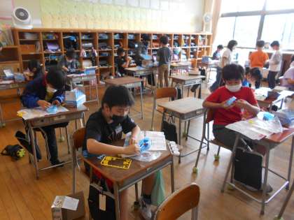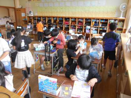 先週に引き続き、電気のはたらきを調べるための実験キットを組み立てました。全員で1時間ほど自由に遊ぶ(使ってみる)時間を取ると、「なぜプロペラの回る向きが人によって反対になるのか?」「なぜ、車の進む方向が反対になるのか?」と疑問を見出していました。