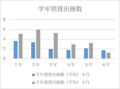上記のグラフは、4月と5月の一人あたりの学年別貸出冊数を比較したものです。ほとんどの学年は、5月の貸出冊数が増えています。