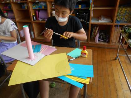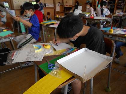 図画工作「コロコロガーレ」の学習の様子です。紙を使ってビー玉がころころと転がるコースをつくっています。友達の作品を見たり、話したりしながらつくることで、様々なアイディアが広がっているようです。