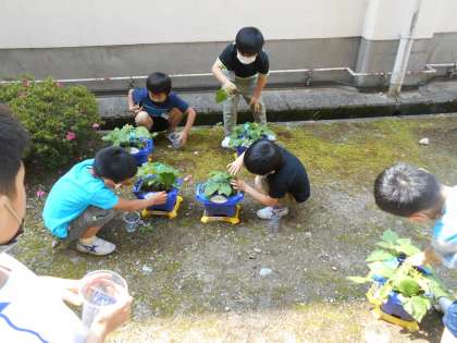 子供たちは、あさがおを観察したり世話をしたりすることを通して、日々成長していることや命をもっていることに気付き、大切に育てています。きれいな花が咲くことを心待ちにしています。