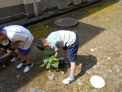 生活科の学習では、あさがおを育てています。今日は、あさがおの本葉が生えてきたので、まびきをしました。根っこを切らないように、そっとやさしくまびきをする子供たちでした。