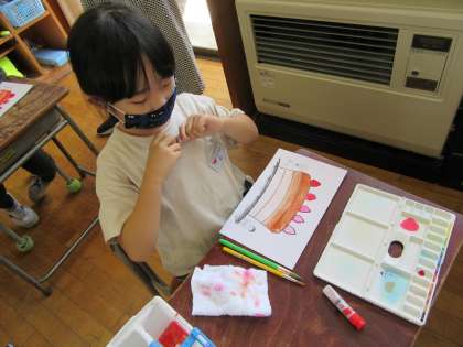 2年生になって初めての水彩学習では、グラデーションに挑戦しました。水の量を工夫しながら、きれいに仕上げることができました。