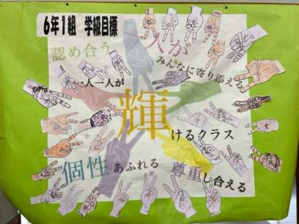 みんなのピースが学級目標の「輝」を囲んでいました。