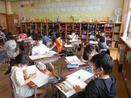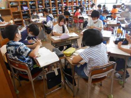 2、3枚目:国語科「一つの花」のあらすじをグループで話し合いながら「いつ、どこで、だれが、なにを、どうしたか」について、読み取っています。