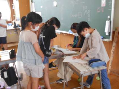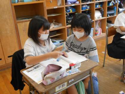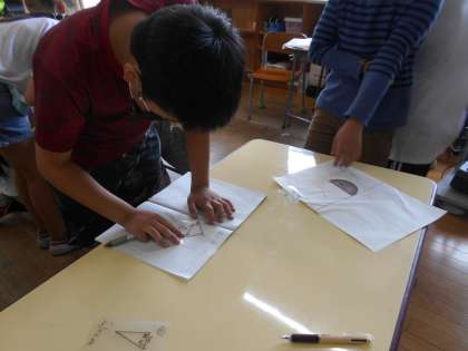 算数の様子です。分度器を使って、図形をかいています。作図問題は繰り返し練習が必要になるため、より多くの問題を解きました。友達と教え合ったり、担任の先生と考えたりしながら進めました。