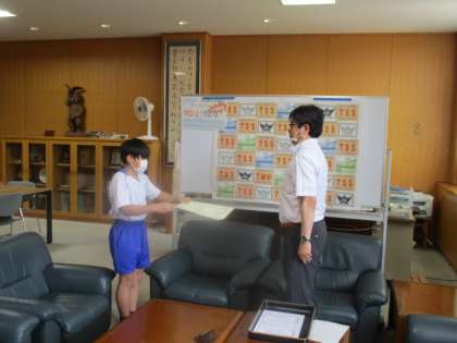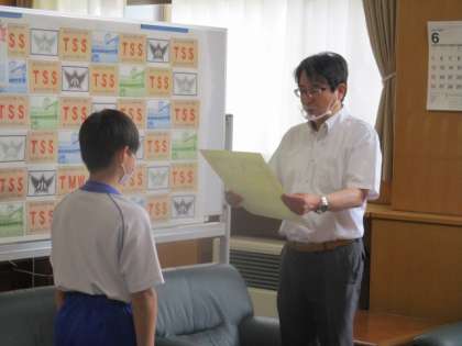 校長室で、先日行われた市の陸上競技大会の表彰式がありました。7月の県大会に向けて、さらに自己記録の更新を目指します。