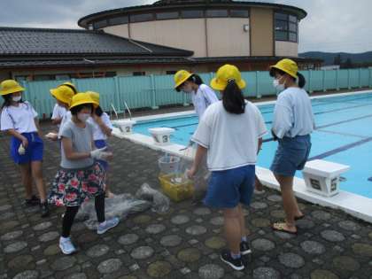 6月20日(月) 全校のみんなのために 公開日 2022/06/21 更新日 2022/06/21 5年生 先日、6年生が中心となって取り組んだプール清掃のおかげで、いよいよ火曜日にはプール開きが行われます。プールサイドの草の清掃までなかなか時間がなくて出来なかった話を聞いていたので、5年生がクラスごとに時間を決めてみんなのために草むしりを手伝いました。暑い中、草むしりの後に、少しだけご褒美に小プールで涼んだ子供たちです。