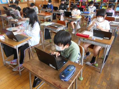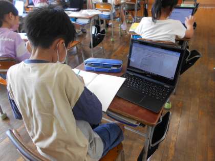 社会科「水はどこから?」について、パソコンで調べ学習を進めていました。調べたことを2ページ以上ノートに記している子供もいました。一人学習が定着しているようです 。