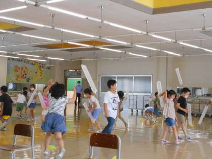子供たちは、かさぶくろをロケットのようにして飛ばして遊んだり、真上に投げたりして遊んだりしていました。