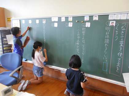 3枚目:「つなぎ言葉」について、自分でつくった文章を黒板に書いて紹介していました。