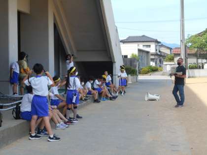 3枚目:体育で50m走のタイムを測りました。たくさんの子供が2か月前よりも速いタイムでゴールを駆け抜けました。