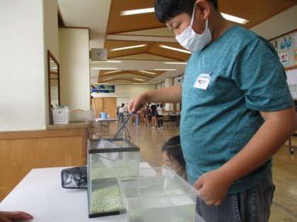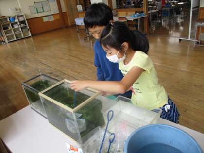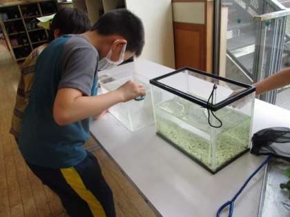 理科の学習で、メダカを育て始めました。水槽への引っ越しを手伝っています。これから、自分たちがこのメダカの親として大切に育てていきます。