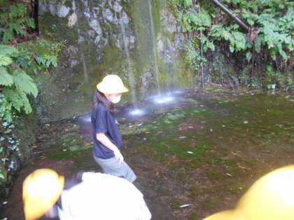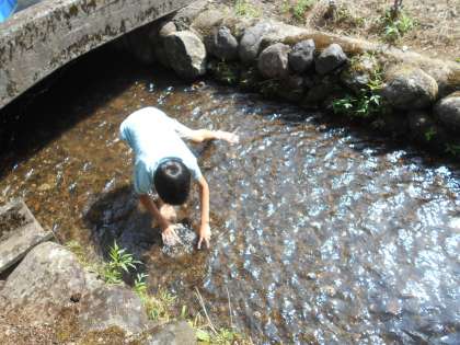 今日は校区探検に行きました。滝を見たり、商店街を歩いたり、公園内の川で遊んだりしました。遊んでいる中でも、子供たちは生き物や建物など、いろいろなものを見つけていました。