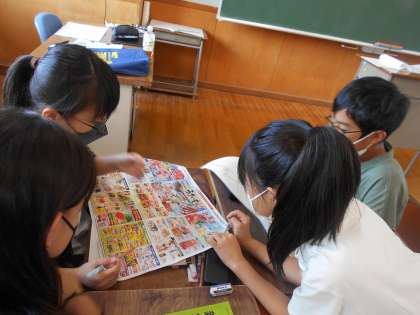 各家庭から持ち寄ったスーパーのチラシを見ながら、食べ物の生産地について白地図にまとめました。「食べ物って、いろんなところから運ばれてくるんだな」「野菜は国内産が多いけど、肉や果物は外国産が多いな」と、たくさんのことに気付くことができました。