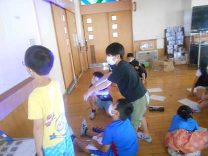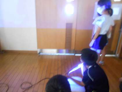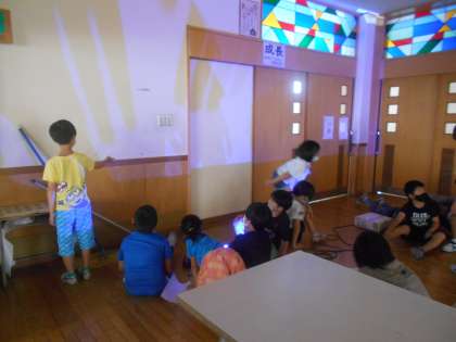 図画工作科「光とかげ」の学習です。暗い部屋に映し出した光を利用して、作品をつくりました。