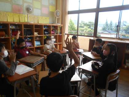 今朝のコミュニケーション活動の様子です。今日は「校長先生!大変です!」という活動を行いました。空想上の物語をつくる活動ですが、子供たちからはたくさんの笑い声が聞こえてきました。内容はお子さんに聞いてみてください。