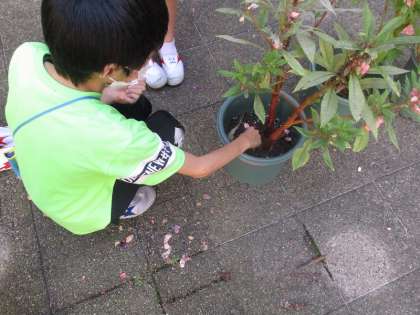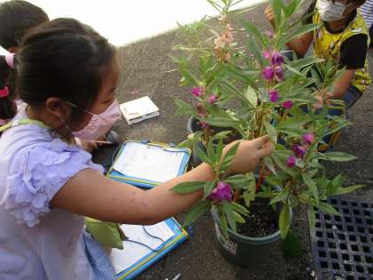 ホウセンカの観察をしました。くきの高さや葉の様子、実の手触りなどをじっくりと観察することができました。熟している実を触ると種がはじけることに驚き、目を輝かしていました。
