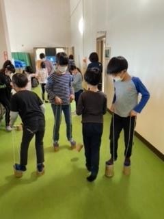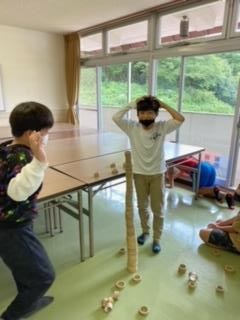 竹のおもちゃを使って、子供たちは楽しく遊んでいます。