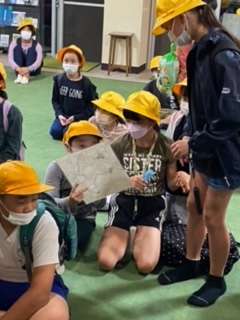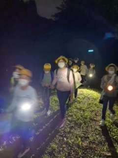 夜の活動、月光ハイクの始まりです。夜の道をみんなで歩きます。静かな森の中では、きれいな虫の鳴き声が聞こえます。