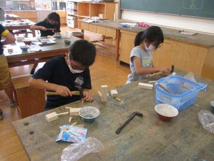 くぎを持つ位置、げんのうを持つ位置や注意することなどに気をつけながら、思い思いの作品を作っています。