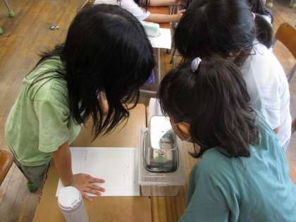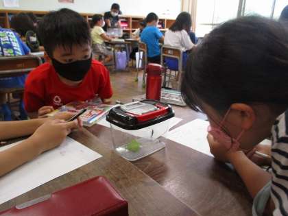 自分で捕まえた昆虫を観察しました。