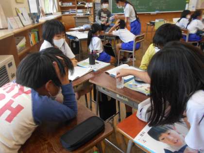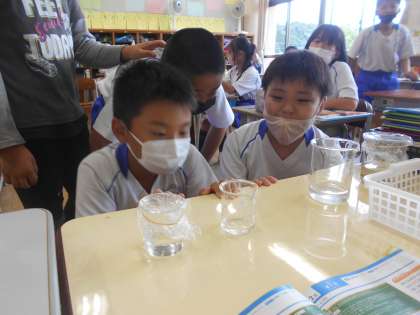 理科の様子です。前回の実験装置を設置してから1週間たったので、「水は空気中に出ていくのか?」の結果と考察を行いました。また、今日は「空気中の水はもとにもどるのか?」という学習課題で予想したあと、実験を行いました。
