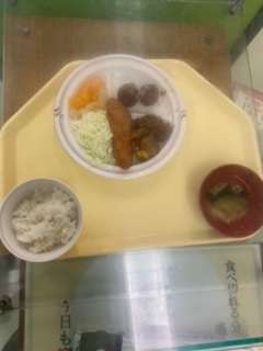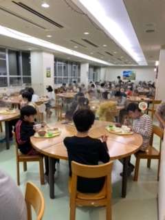 夕食の時間です。バイキングで食べれる分だけ取って食べます。静かに食べています。