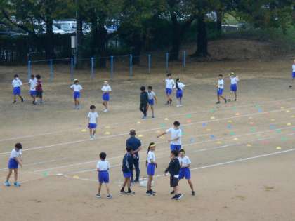 3枚目:体育はリレーをしていました。写真は集合途中に撮ったものですが、子供たちは担任に気付いて手をふってくれました。