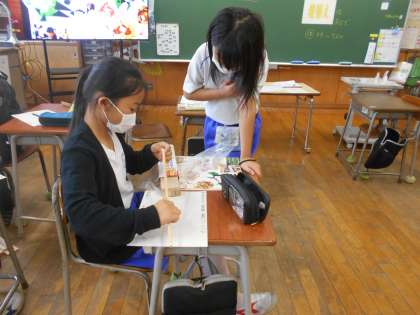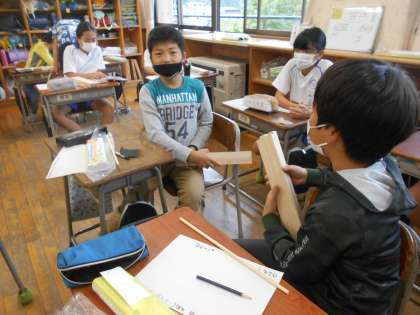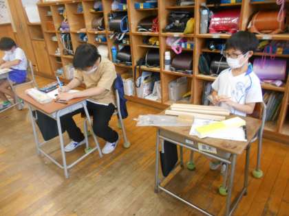 図工の様子です。「ギコギコトントン」という教材で、木の棒を切って作品をつくります。今日は材料を触りながら想像し、設計図や完成図を書きました。始める前はみんな同じ形の材料ですが、活動を進めるとどんな風に変わっていくのか楽しみです。