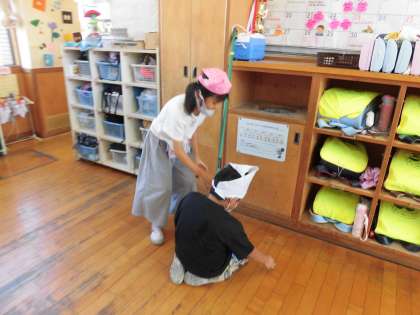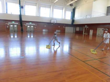 ある日の体育の授業中、体育館が強風により砂まみれになっていました。それを見た子どもたちは、「体育館をきれいにしたい」と言いました。しかし、体育館は6年生の清掃担当場所です。それを知った子どもたちは、6年生にお願いし、週に2回、体育館掃除に参加させてもらっています。自分たちで動く姿がとても立派であると感じました。