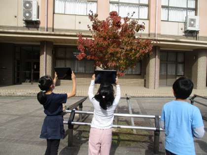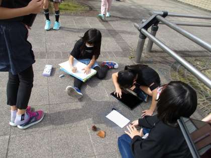 今日は、学校の周りに秋らしくなったものを探しに行きました。