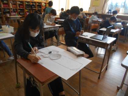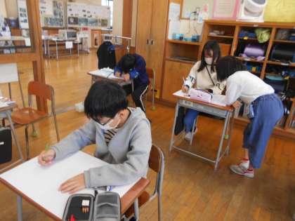 図画工作科「忘れられない気持ち」の続きです。今日は多くの子供が色付けの前段階まで進みました。