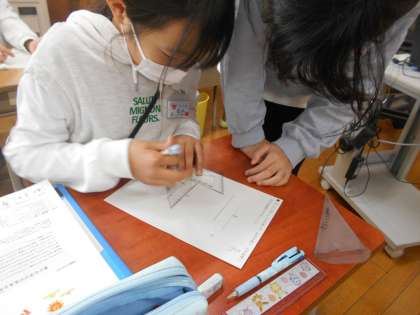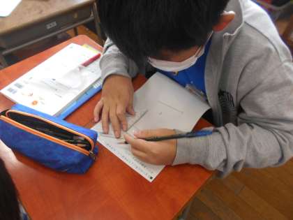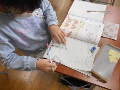算数の作図の様子です。片方の手で定規を2枚押さえ、もう片方の手で直線を描くのは慣れないとなかなか難しいものです。