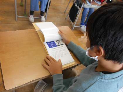 今日のスタートタイムは学年読書でした。総合で扱った「内野信一」社会科で扱った「椎名道三」に関する本を借りている子供もいました。
