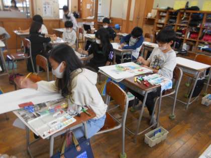 図画工作科の様子です。各学級、「忘れられない気持ち」の絵が完成に近づいてきています。授業参観では、完成した掲示をご覧ください。