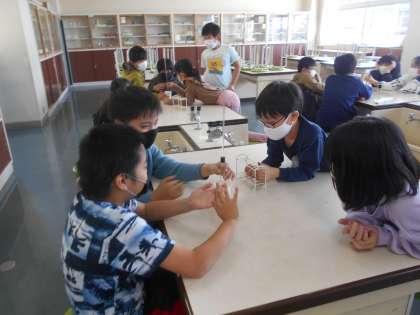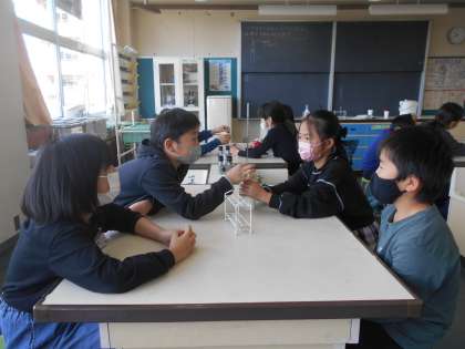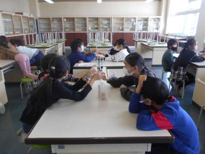 理科の実験の様子です。昨日調べたものは「空気」でしたが、今日は「水はあたためたり冷やしたりしたら体積が変わるのか?」を調べました。