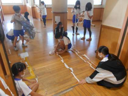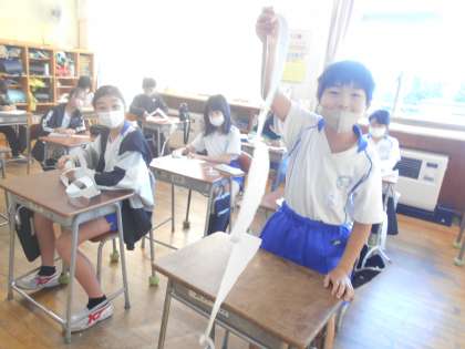 今朝のスタートタイムはコミュニケーション活動です。1枚の紙をどれだけ長く伸ばせるか学級で競い合いました。みんなで比べてみたところ、一位はYさんでした。