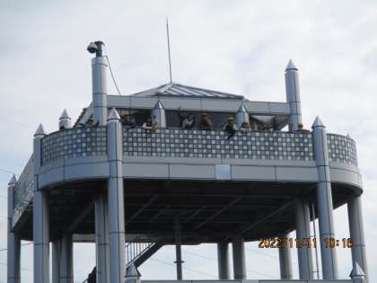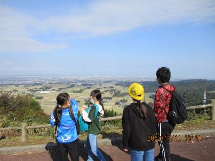 秋晴れの青空と、大沢野特有の風が吹く中、山々の紅葉を楽しみながら、風の城をさらに目指しました。富山市内を一望できる風の城に到着したときは、みんなへとへとでしたが、全員が無事たどり着くことができました。
