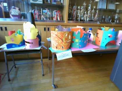 2年生では、カッタ一ナイフタワーをつくています。これは、1くみさんのさくひんです。すてきですね。