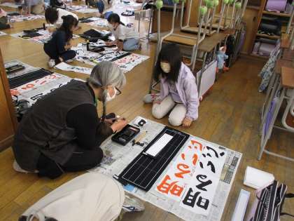 子供たちは、お手本の字に近づけようと慎重に書いたり、金賞を取りたいというめあてに向かって集中して取り組んだりしていました。