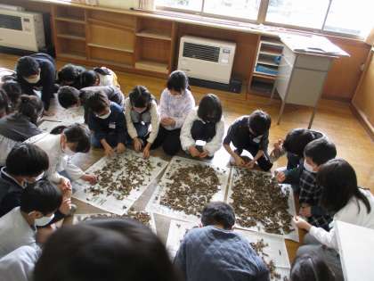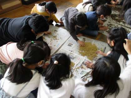 今は、収穫した大豆を豆腐やきなこにしてみたいと思い、どうするか考えている子供たちです。どんどん挑戦してほしいと思います。