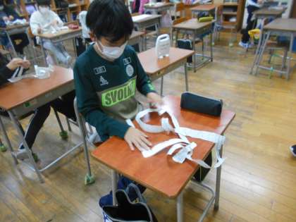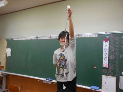 1、2枚目:紙をちぎってどれだけのばせるか競っていました。一位はAさんだったようです。