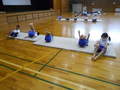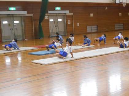 1年生の体育科ではマット運動を行っています。動物歩きやゆりかごをしながらマット運動に必要な感覚を身に付けられるように練習を頑張っています。
