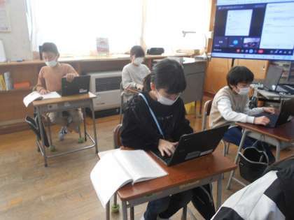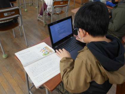 全員が学級にそろうことがなかなかできないため、今回はパソコンをノート代わりにしてオンライン対応の授業としています。