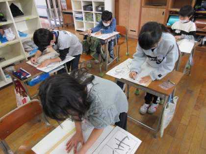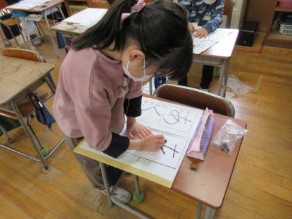 先週より、書き初め練習を始めました。お手本をじっくり見ながら、丁寧に書いています。自分の作品を見て、「ここがお手本と違うな」「次は、この画をもう少し長く書こう」などと、目当てを決めて取り組む姿が素敵です。